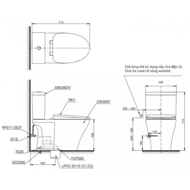 - Phù hợp lắp đặt với nắp rửa điện tử WASHLET (tùy chọn)