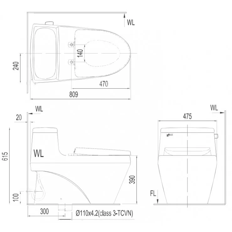 Bản vẽ bệ xí bệt Inax 1135 xả nhấn nắp êm