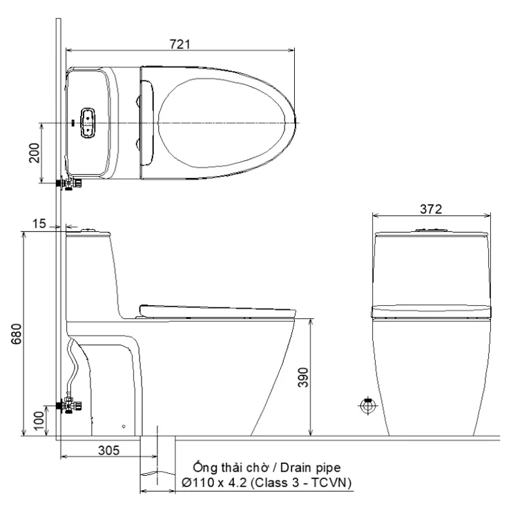 - Kích thước bồn cầu Inax: 721x372x680 mm (DxRxC)