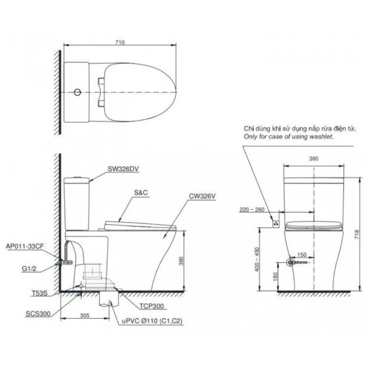 Bản vẽ bồn cầu CS326 nắp rửa cơ TCW07S TOTO