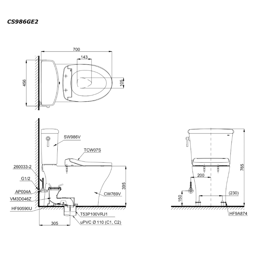 Bản vẽ kích thước bồn cầu CS986 nắp rửa cơ TCW07S TOTO