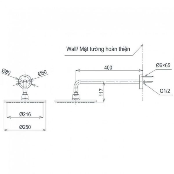 Bản vẽ bát sen tắm TBW 07002A MBL TOTO gắn tường 250 mm