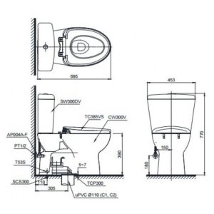 Bản vẽ kích thước bàn cầu TOTO CS300DT10