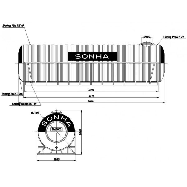 Bản vẽ téc nước inox 15000 lít ngang SUS 304 Sơn Hà phi 1700