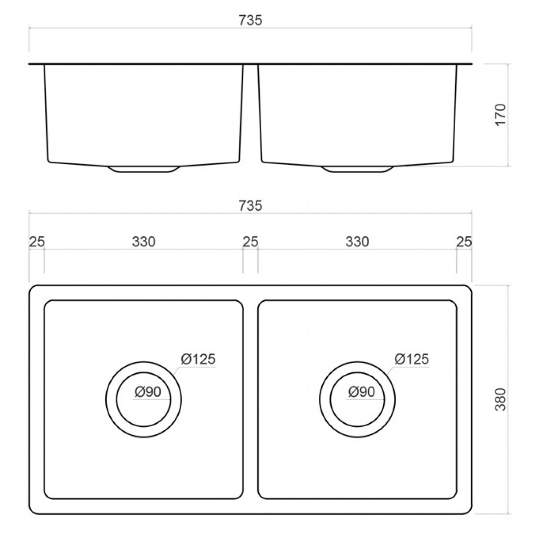 Bản vẽ kích thước chậu bếp đồng Kanly BCS 257 735x380mm