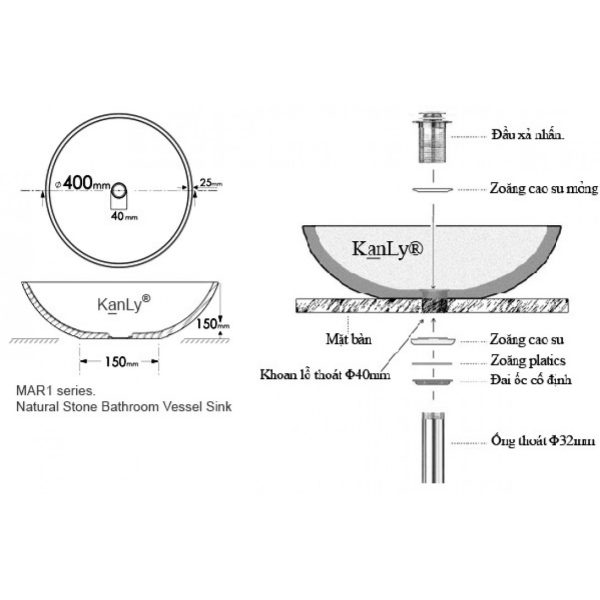 Bản vẽ kích thước chậu rửa mặt đá tự nhiên Kanly MAR15N