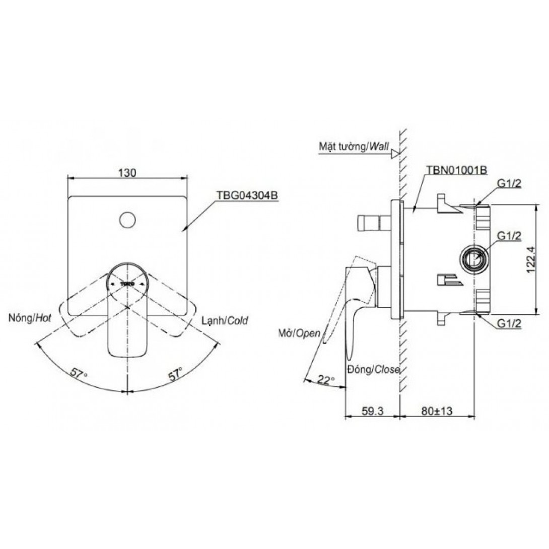 Bản vẽ van gật gù nóng lạnh TOTO TBG 04304BB MBL kèm nút chuyển hướng