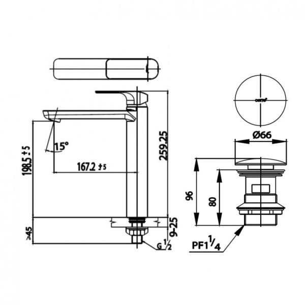 Bản vẽ kích thước vòi lạnh Cotto CT1143AY BL