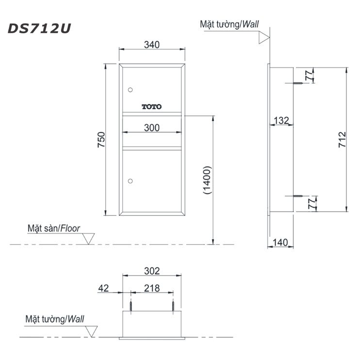 Bản vẽ hộp giấy âm tường Toto DS 712 U