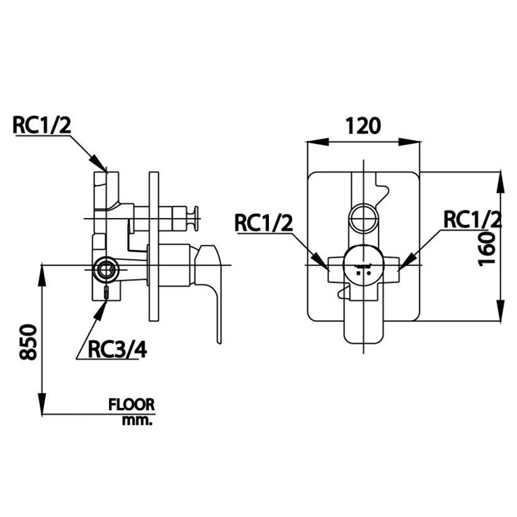 Bản vẽ kích thước van âm tường CT 2145A BL Cotto nóng lạnh