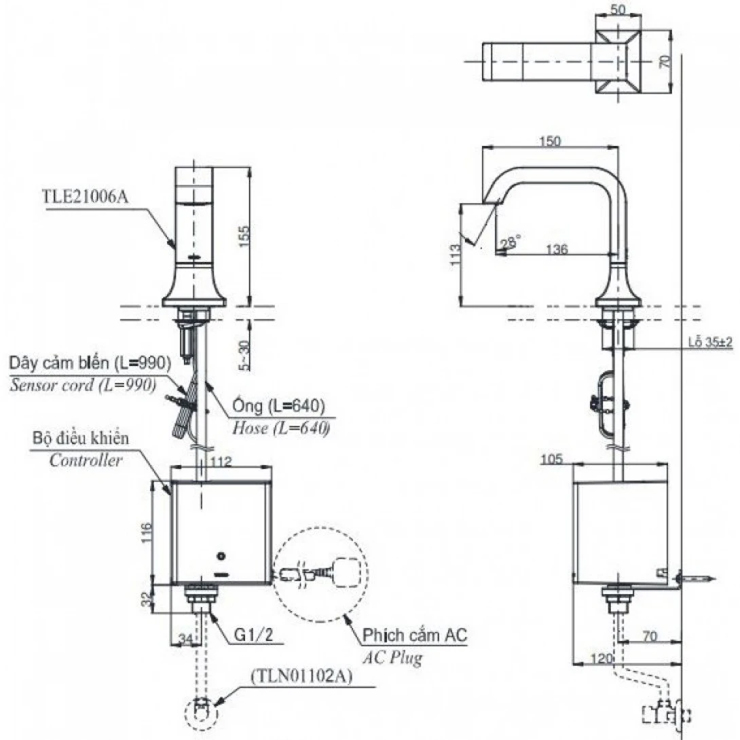Bản vẽ kích thước vòi TOTO TLE21006A-TLE01502A1-TLN01102A 220V