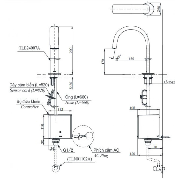Bản vẽ kích thước vòi tự động TOTO TLE24007 A