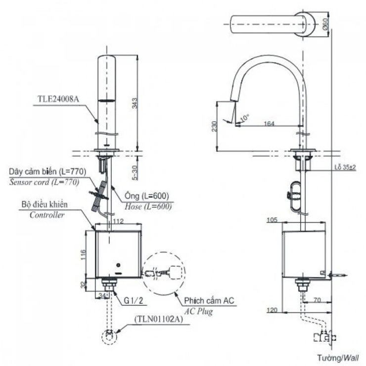 Bản vẽ kích thước vòi tự động TOTO TLE24008A+TLE01502A1+TLN01102A