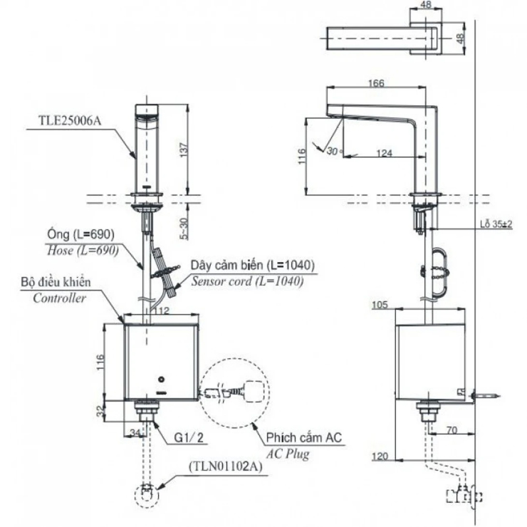 Bản vẽ kích thước vòi TOTO TLE25006A-TLE04502A1-TLN01102A