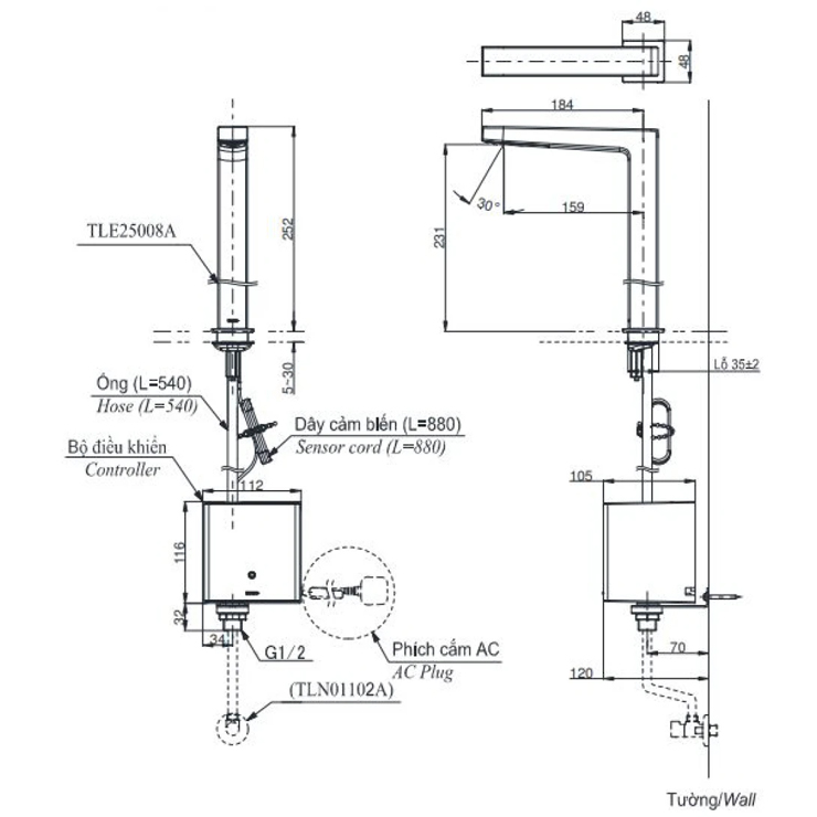 Bản vẽ vòi tự động TOTO TLE 25008 A