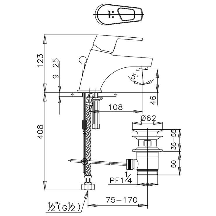 Bản vẽ kích thước vòi chậu nóng lạnh Cotto CT 2017 A