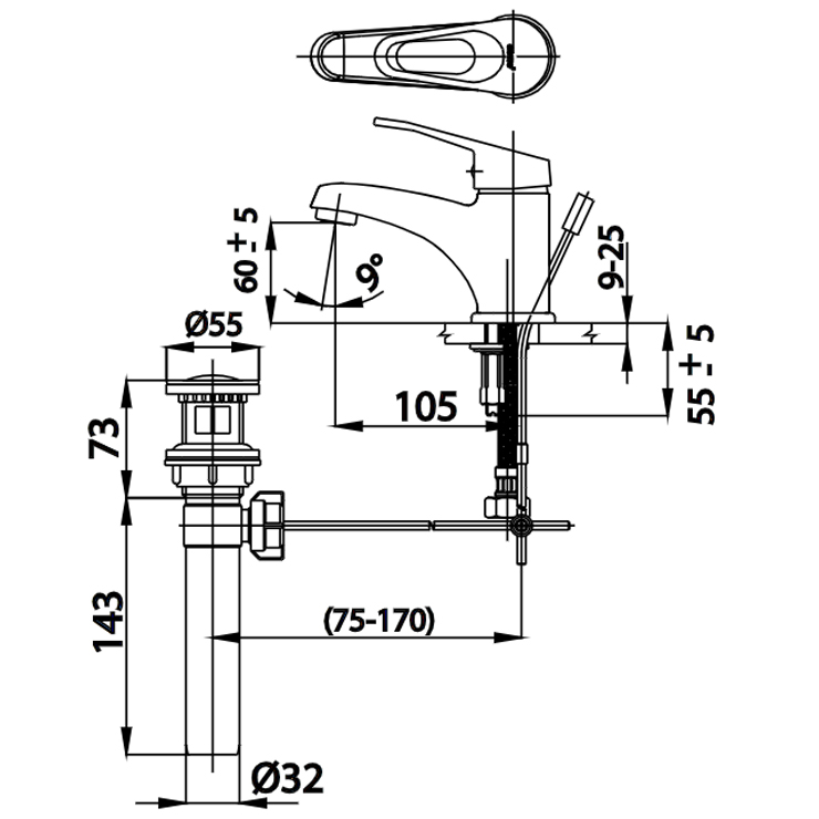 Bản vẽ kích thước vòi rửa mặt nóng lạnh cotto CT 2171 A