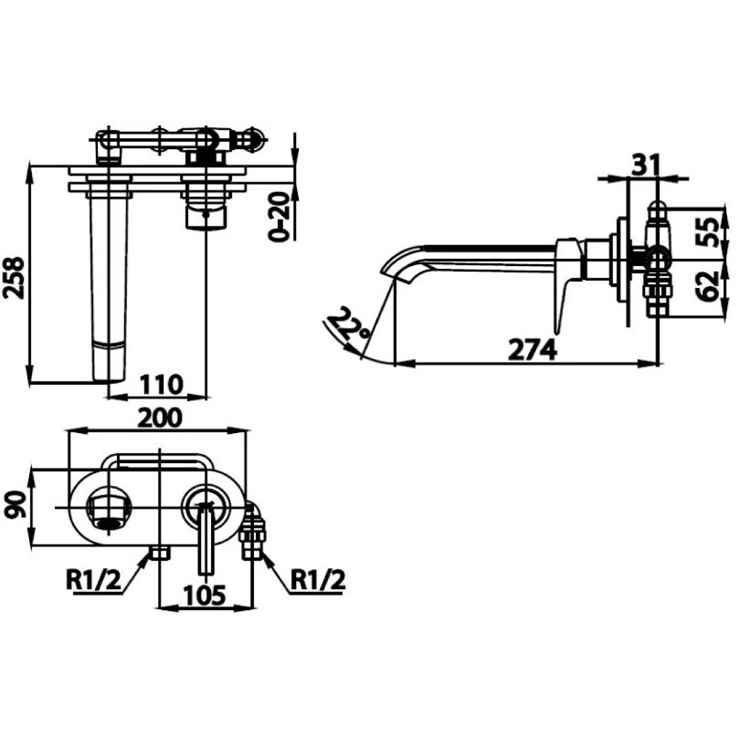 Bản vẽ kích thước vòi lavabo gắn tường Cotto ct 2263 a