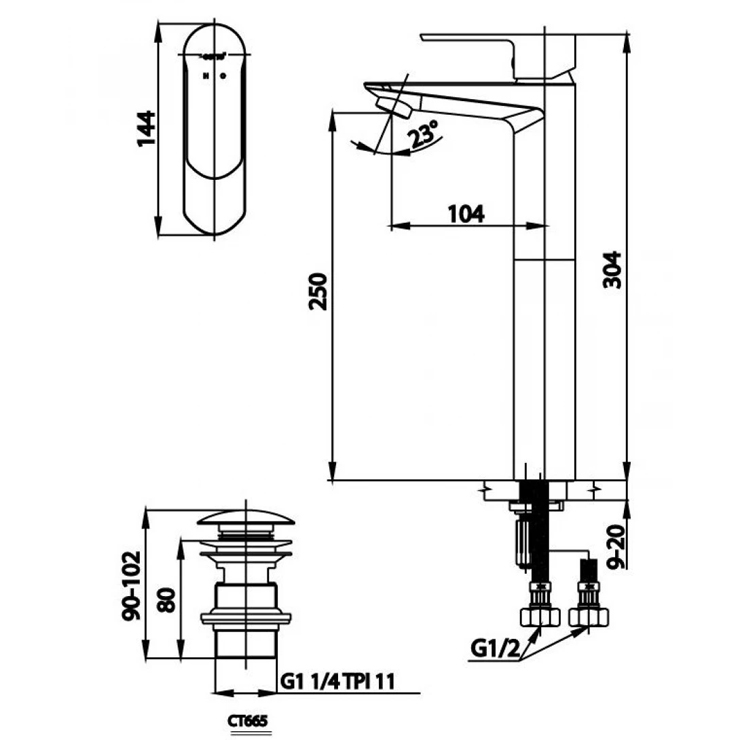 Bản vẽ kích thước vòi chậu rửa mặt CT2402 AY Cotto