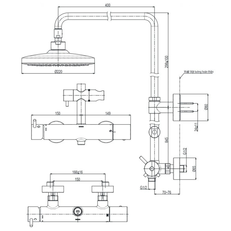 Bản vẽ kích thước vòi hoa sen tắm TOTO TBW01302